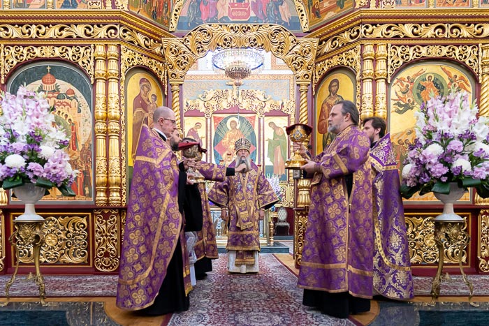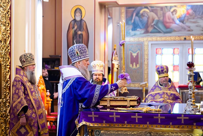На аналое в центре храма возлежали изнесенный накануне Крест – дар приснопамятного Блаженнейшего Патриарха Иерусалимского Диодора с частицами Животворящего Древа Креста Господня.