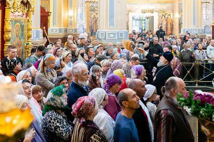 Литургия завершилась славлением перед Крестом Господним – духовенство, хор и народ пропели тропарь, кондак и величание празднику, а также стихиру «Кресту Твоему покланяемся, Владыко…».