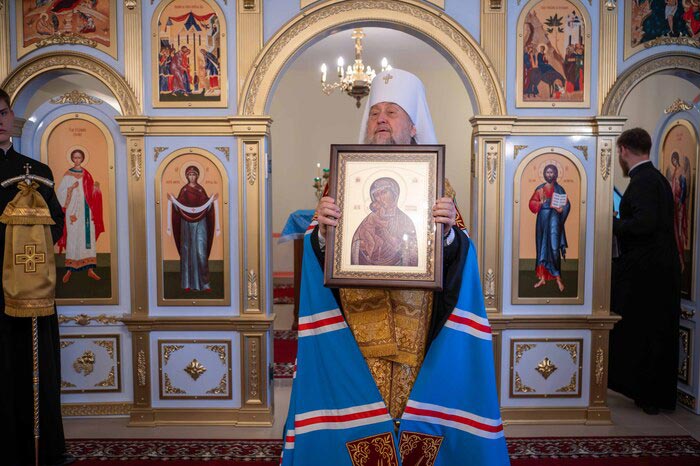 В дар Покровскому храму владыка митрополит передал святые иконы – «Христос – Великий Архиерей» и Феодоровский образ Царицы Небесной.