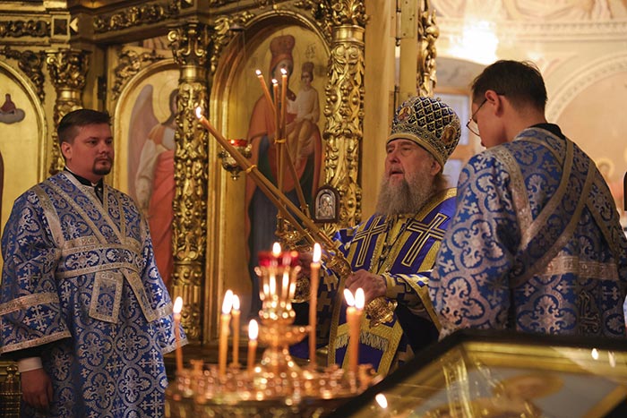 В завершение Литургии состоялось славление Казанской иконе Пресвятой Богородицы, после чего Его Высокопреосвященство тепло поздравил духовенство и прихожан с праздником и обратился к собравшимся со словом о почитании Божией Матери.