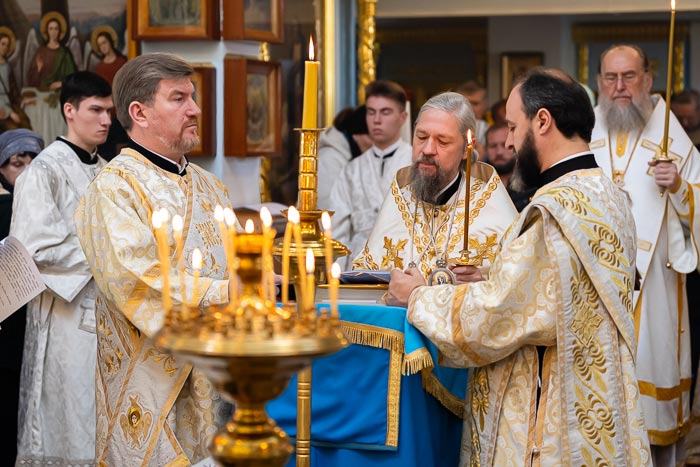 Главе Митрополичьего округа сослужили: викарии Астанайской епархии – управляющий делами Казахстанского Митрополичьего округа епископ Каскеленский Геннадий и епископ Талгарский Вениамин; благочинный приходов Южной столицы, настоятель Никольского собора протоиерей Валерий Захаров; настоятель алма-атинского храма в честь иконы Божией Матери «Всех скорбящих Радость» митрофорный протоиерей Евгений Воробьев; духовник Алма-Атинской епархии архимандрит Иоанн (Сазонов); настоятели и духовенство храмов Южной столицы.