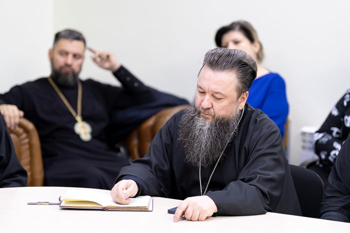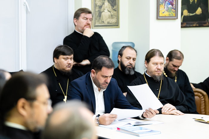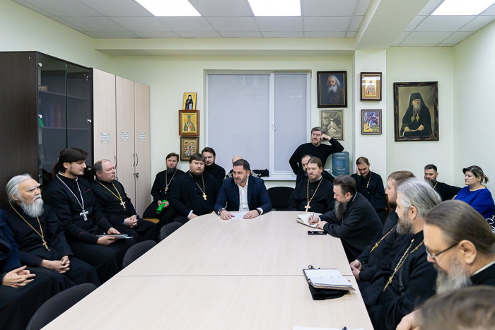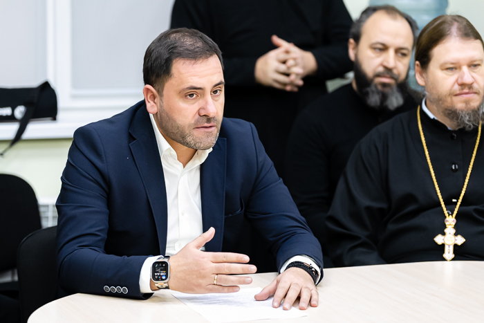 В начале собрания протоиерей Евгений Иванов обратился к собравшимся с приветственным словом, после чего представил присутствующим руководителя общественного фонда «Eleos-Meirim» В.М. Капсамун. Валерий Михайлович проинформировал членов преподавательской корпорации о реализации совместных проектов семинарии и возглавляемой им благотворительной организации.