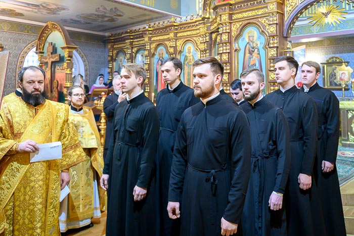 Перед началом богослужения Предстоятель Православной Церкви Казахстана совершил хиротесию во чтецов учащихся старших курсов духовной школы: Георгия Ткаченко, Александра Гончарова, Михаила Калмыкова, Владимира Юдина, Илью Воробьева, Николая Толмачева, Даниила Пасюка, Владислава Платонова.