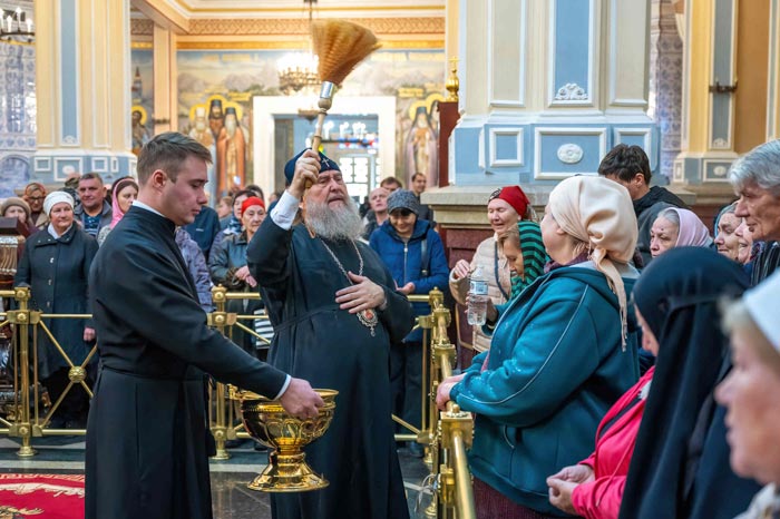 Литургия завершилась славлением перед Крестом Господним – духовенство, хор и народ пропели тропарь, кондак и величание празднику, а также стихиру «Кресту Твоему покланяемся, Владыко…».