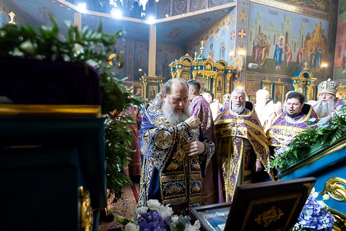 В завершение Литургии состоялось поклонение честному Кресту Господню и славление блаженной старице Матроне перед ковчегом с ее мощами.