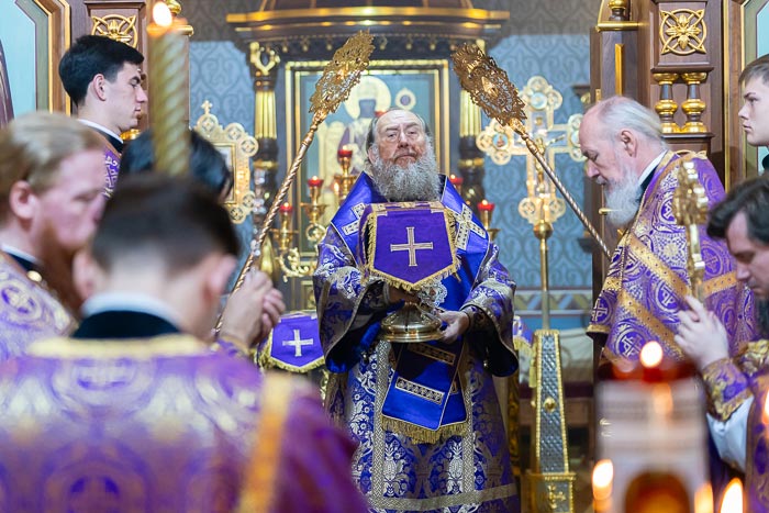 Литургия завершилась поклонением Честному и Животворящему Кресту и славлением благоверным князьям Олегу Брянскому и Михаилу Черниговскому, после которого Глава Митрополичьего округа обратился к молящимся со словами поучения.