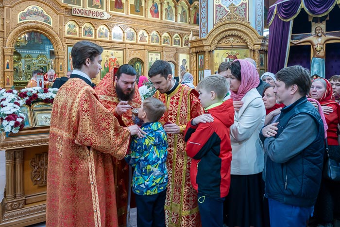 В завершение Литургии состоялось славление светлому Христову Воскресению и Пресвятой Богородице, после чего Глава Митрополичьего округа произнес возглас «Христос воскресе!» на разных языках – древних и современных.