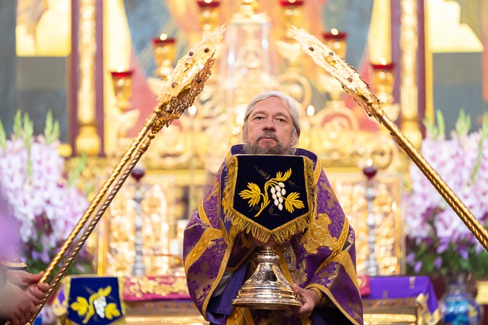 На аналое в центре храма возлежали изнесенный накануне Крест – дар приснопамятного Блаженнейшего Патриарха Иерусалимского Диодора с частицами Животворящего Древа Креста Господня.