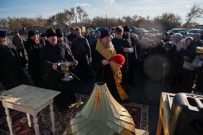 После прочтения уставных молитв владыка митрополит окропил крест святой водой.