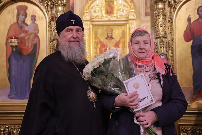 По окончании богослужения Его Высокопреосвященство наградил Н.В. Левину медалью святых мучениц Веры, Надежды, Любови и Софии.