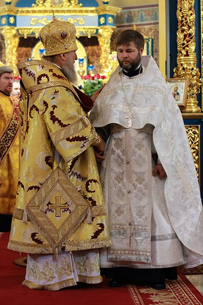 После херувимской песни митрополит Александр совершил священническую хиротонию диакона Георгия Черных, клирика Константино-Еленинского собора города Костаная.