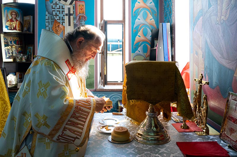 На заупокойной ектении владыка вознес сугубые молитвы о упокоении приснопамятного митрополита Хрисанфа (Чепиля) и новопреставленного иеромонаха Мелитона (Поротикова).