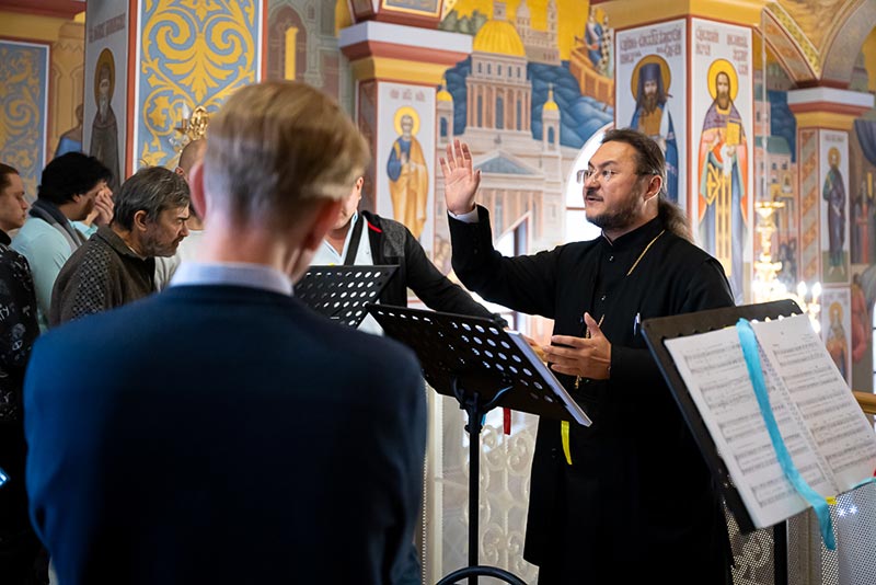Литургические песнопения прозвучали в исполнении мужского хора Вознесенского собора под управлением игумена Филиппа (Моисеева).