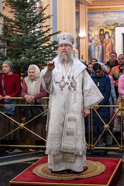 Глава Православной Церкви Казахстана сказал слова поздравлений в адрес владыки Клавдиана, священнослужителей, монашествующих и мирян, поблагодарил собравшихся за радость общей молитвы в начале святочного периода и произнес проповедь.