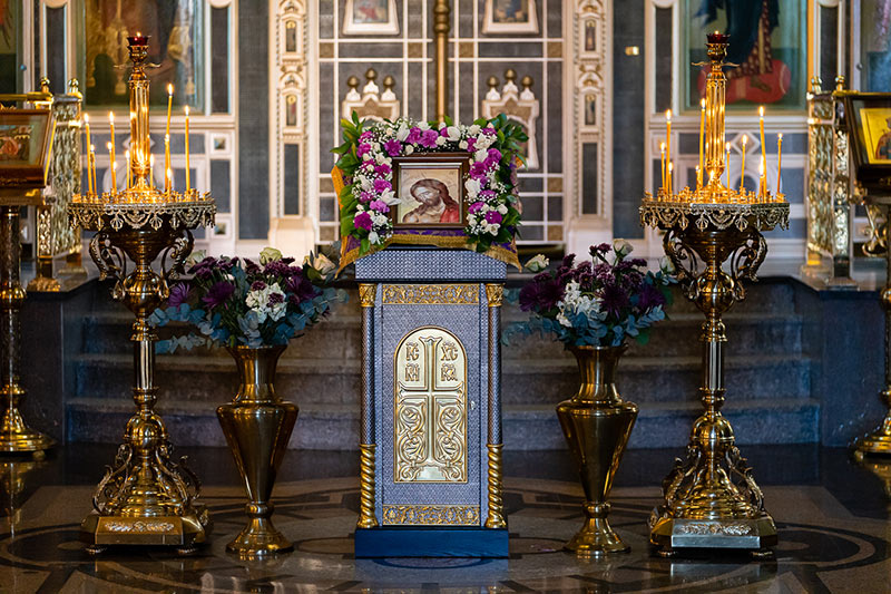 После отпуста Литургии было совершено славление перед древним Тихвинским образом Пресвятой Богородицы (начало XVIII века), хранящимся в Князь-Владимирском храме. Святыня была подарена православной пастве Митрополичьего округа Президентом Республики Казахстан Н.А. Назарбаевым 6 апреля 2018 года к празднику Светлого Христова Воскресения. Икона является старинным списком с явленного в XIV веке Тихвинского образа Божией Матери, выполненная монахом Тихвинского Успенского монастыря Аароном в 1706 году. Начиная с середины XVIII века подаренная главой государства икона была почитаема, как чудотворная. Икона исполнена «в меру и подобие», то есть с повторением размеров иконографии и цветового решения оригинала. Оклад иконы – работа одного из ведущих новгородских ювелиров-серебряников, выполненная в 1741 году. Это один из немногих сохранившихся до наших дней оригинальных окладов такого размера.
