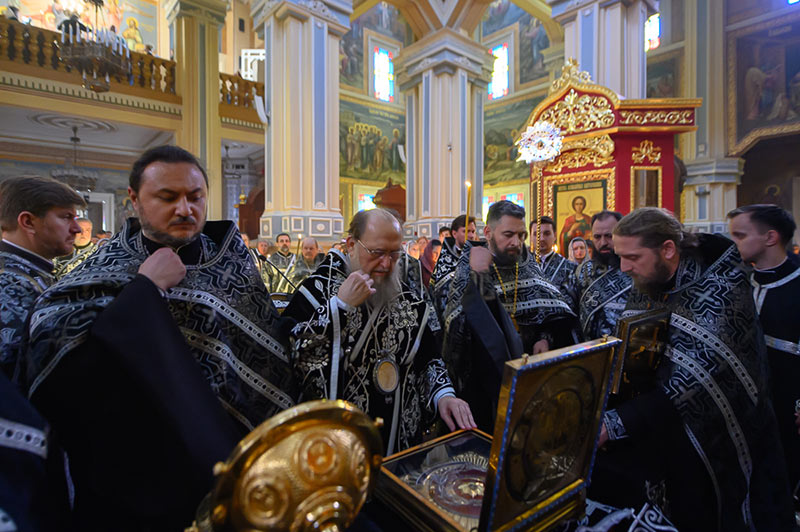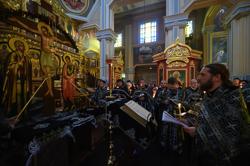 В начале утрени, под пение тропаря «Егда славнии ученицы», священнослужители изнесли из алтаря святое Евангелие и возложили на аналое перед изображением Распятия Спасителя с предстоящими Пресвятой Богородицей и апостолом Иоанном Богословом, установленным посредине храма.