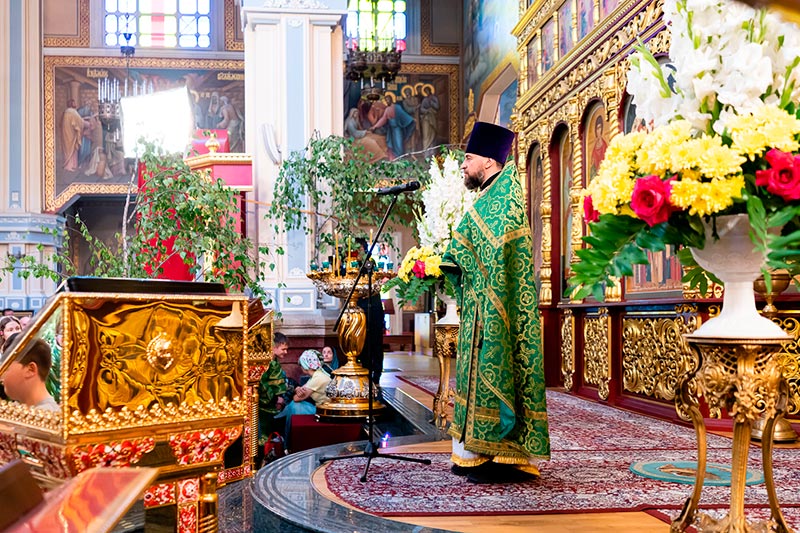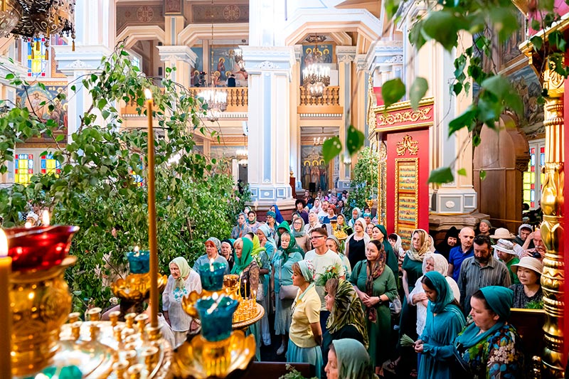 По древнему обычаю, берущему свое начало еще в ветхозаветные времена, в праздник Пятидесятницы храм был украшен ветвями деревьев, растениями и цветами. Священнослужители и прихожане на протяжение богослужения держали в руках цветы и ветви, символизирующие таинственное обновление человеческих душ силою Святого Духа.