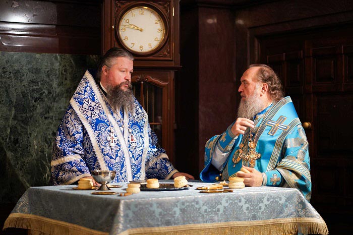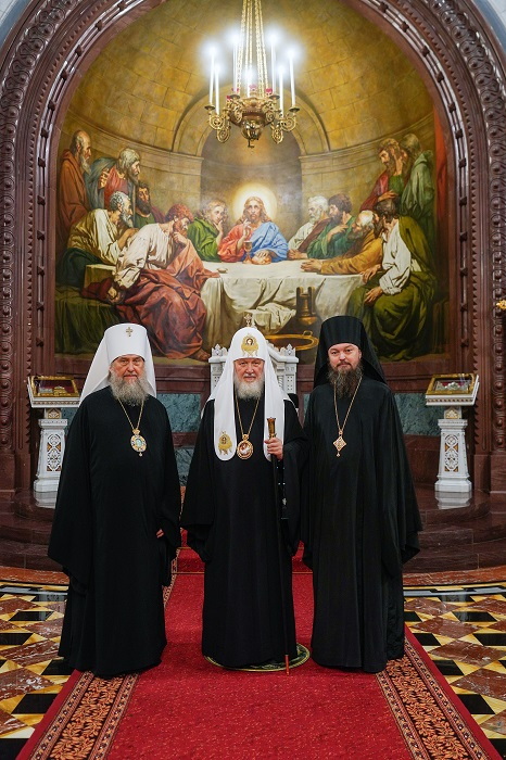 Его Святейшеству сослужили: митрополит Астанайский и Казахстанский Александр, Глава Православной Церкви Казахстана; митрополит Воскресенский Дионисий, управляющий делами Московской Патриархии, первый викарий Патриарха Московского и всея Руси по городу Москве; архиепископ Усть-Каменогорский и Семипалатинский Амфилохий; епископ Видновский Тихон; епископ Серпуховской Роман; епископ Зарайский Константин; протопресвитер Владимир Диваков, секретарь Патриарха Московского и всея Руси по городу Москве; протоиерей Михаил Рязанцев, ключарь Храма Христа Спасителя; архимандрит Алексий (Туриков), личный секретарь Святейшего Патриарха Кирилла; архимандрит Феодосий (Курьянов), настоятель кафедрального собора Михаила Архангела города Уральска (Уральская епархия); архимандрит Дионисий (Козулев), благочинный Уральского церковного округа; протоиерей Павел Придатченко, клирик Ханты-Мансийской епархии; столичное духовенство.