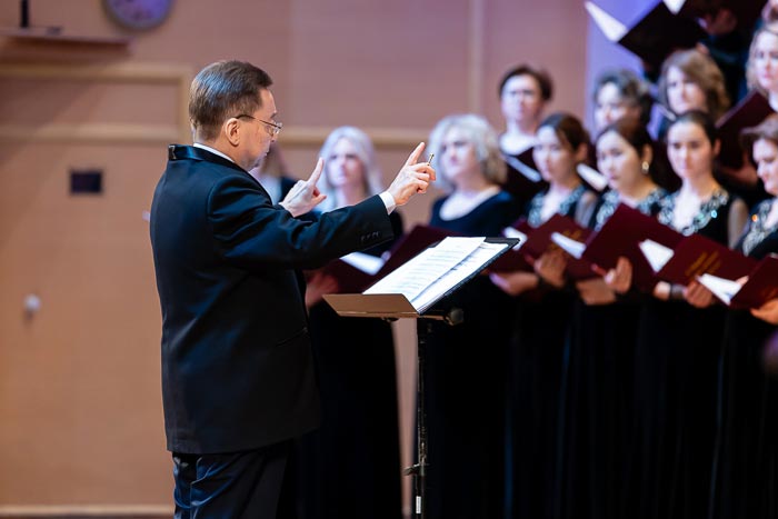 Главным событием вечера стало исполнение сводным хором Казахстанского Митрополичьего округа и Государственной капеллы имени Б. Байкадамова под руководством А.А. Пузакова песнопений Литургии святителя Иоанна Златоуста на музыку великого композитора.