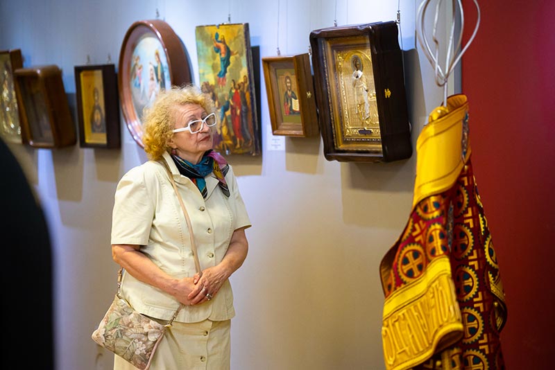 О части экспозиции, представляющей иконы и предметы богослужебной утвари, переданные для выставки Предстоятелем Православной Церкви Казахстана, гостям рассказал иерей Георгий Сидоров, руководитель административного секретариата Главы Митрополичьего округа.