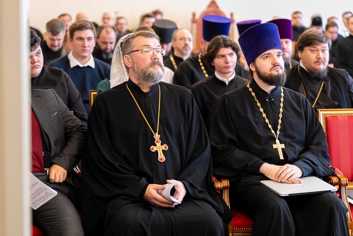 Ректор Казанской православной духовной семинарии иерей Никита Кузнецова, проректор по общим и социальным вопросам Кузбасской православной духовной семинарии протоиерей Алексей Нагорный и заведующий библиотекой Минской духовной семинарии, кандидат богословия архимандрит Никодим (Генералов) обратились с приветственными словами к участникам научного форума.