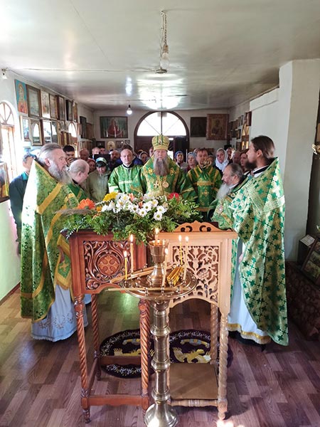В завершение Литургии духовенство пропело славление двунадесятому празднику и преподобному Силуану, после которого владыка поздравил настоятеля и прихожан с престольным праздником и произнес проповедь о святом Силуане.