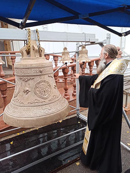 Затем владыка совершил освящение нового комплекта колоколов для колокольни Богоявленского храма. Наиболее тяжелый из колоколов весит 820 килограмм. Колокол украшают рельефные изображения – иконы Пресвятой Троицы, Господа Вседержителя, Божией Матери и пророка Иоанна Предтечи.