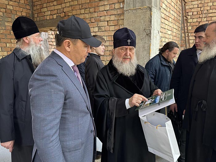 Епископ Хрисанф проинформировал владыку митрополита о завершении монтирования электрических сетей, заливке чистовой стяжки пола, подготовке к облицовке фасадов травертином и установке малых куполов.