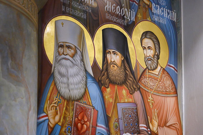 The work on creating the altar paintings of the Kazan Cathedral was carried out over four months by a group of five Almaty icon painters under the direction of the isographer G.P. Kiseleva. The area of the painted walls and vaults was 168 square meters. The main plot of the completed works is dedicated to the event of the Resurrection of the Lord Jesus Christ. In the altar apse there is an image of the Resurrection of Christ surrounded by angels, on the northern and southern walls there are angels and saints glorifying the risen Lord Jesus, on the crossbar of the iconostasis wall there is an image of the Savior Not Made by Hands. The host of saints depicts the new martyrs and confessors of Kazakhstan: Metropolitan Nicholas of Alma-Ata (Mogilevsky), Bishop of Vernensky Pimen (Belolikov), Bishop of Peter and Paul Methodius (Krasnoperov), Schema-Archimandrite Sebastian (Fomin), Hieromonks Seraphim (Theologian) and Theognost (Pivovarov), priests Vasily Kolmykov from Zharkent, Vissarion Selinin from Urdzhar, Vladimir Tsedrinsky from Lepsinsk, priest Parfeniy Krasivsky, who served in the Kazan Cathedral and suffered for Christ on the porch of his native church. Next to the saints of God is placed the figure of the ascetic of piety of the twentieth century, the ever-memorable Metropolitan Joseph (Chernov), revered by a huge number of Orthodox believers both in Kazakhstan and far beyond its borders.