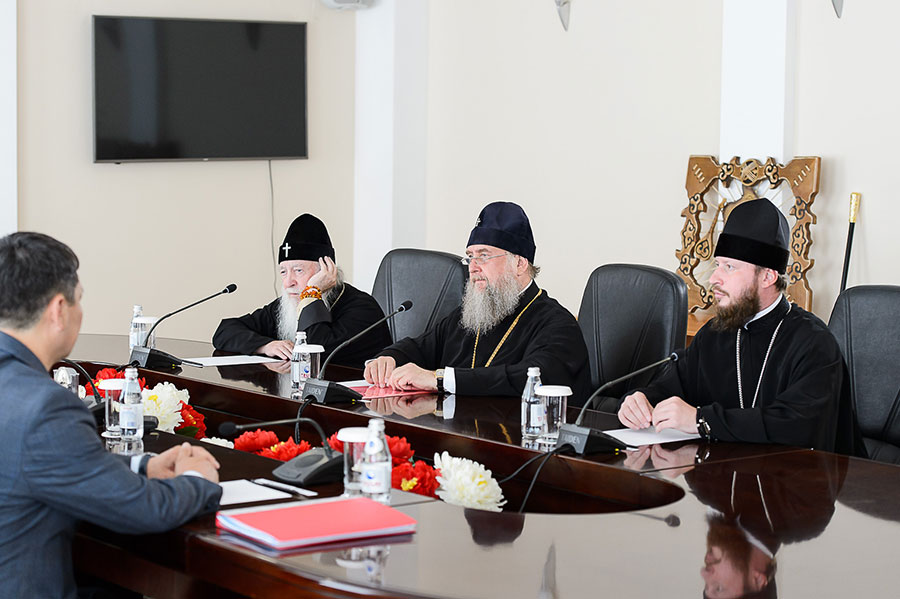 31 июля 2019 года. Актобе. Глава Митрополичьего округа Русской Православной Церкви в Республике Казахстан митрополит Астанайский и Казахстанский Александр встретился с акимом Актюбинской области О.С. Уразалиным.